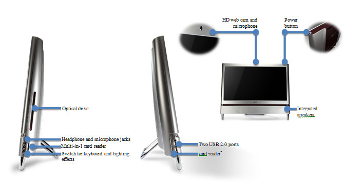 I/O ports: Side - Two USB 2.0 ports, Multi-in-1 card reader, High-definition headphone and microphone jacks, Ambient light switch. Rear - Four USB 2.0 ports, DC-in jack, Ethernet (RJ-45) port, Four audio ports, eSATA port, IR blaster port 2 (with TV-tuner card only), TV-tuner port2